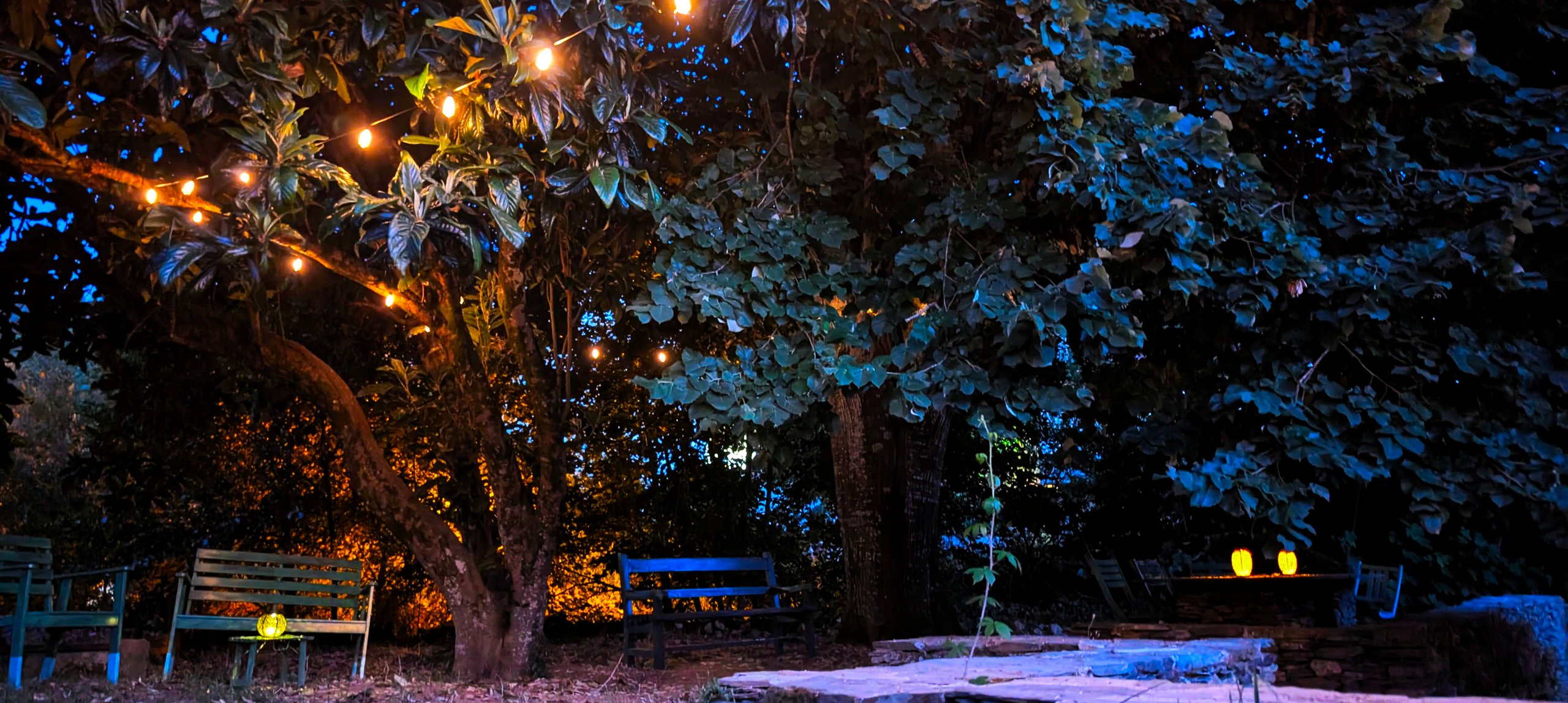 Bem no coração do jardim ergue-se a nossa centenária tília — um elemento simbólico da Terra Verde. Abaixo da sua copa generosa encontra-se uma larga mesa de pedra que naturalmente reúne as pessoas: o local ideal para conversas prolongadas, refeições partilhadas ou trabalho em grupo contemplativo.